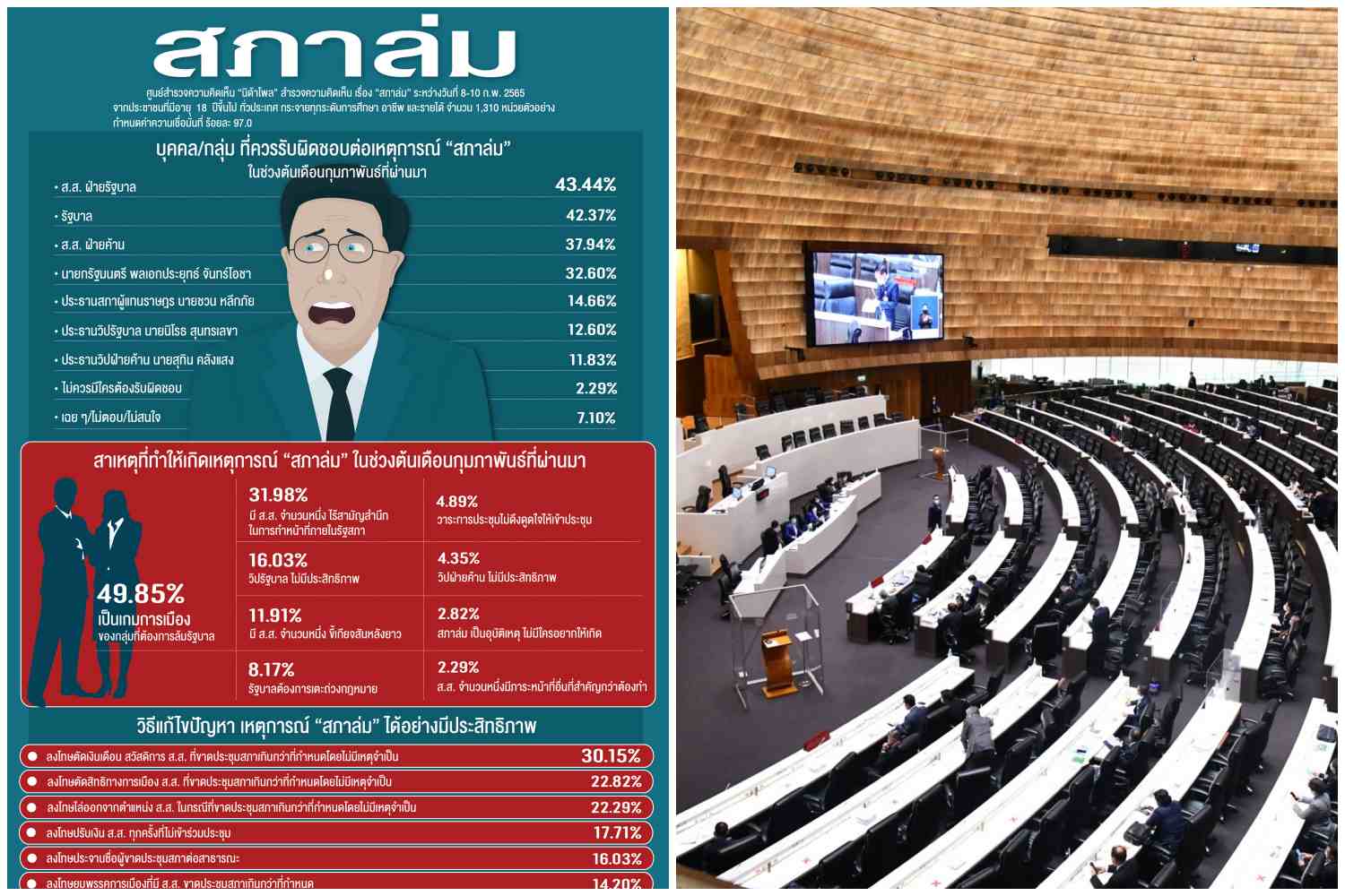 ศูนย์สำรวจความคิดเห็น “นิด้าโพล” สถาบันบัณฑิตพัฒนบริหารศาสตร์ (นิด้า) เปิดเผยผลสำรวจของประชาชน เรื่อง “สภาล่ม” ทำการสำรวจระหว่างวันที่ 8-10 กุมภาพันธ์ 2565 จากประชาชนที่มีอายุ 18 ปีขึ้นไป กระจายทุกภูมิภาค ระดับการศึกษา อาชีพ และรายได้ทั่วประเทศ รวมทั้งสิ้น จำนวน 1,310 หน่วยตัวอย่าง เกี่ยวกับเหตุการณ์ “สภาล่ม” ในช่วงต้นเดือนกุมภาพันธ์ที่ผ่านมา