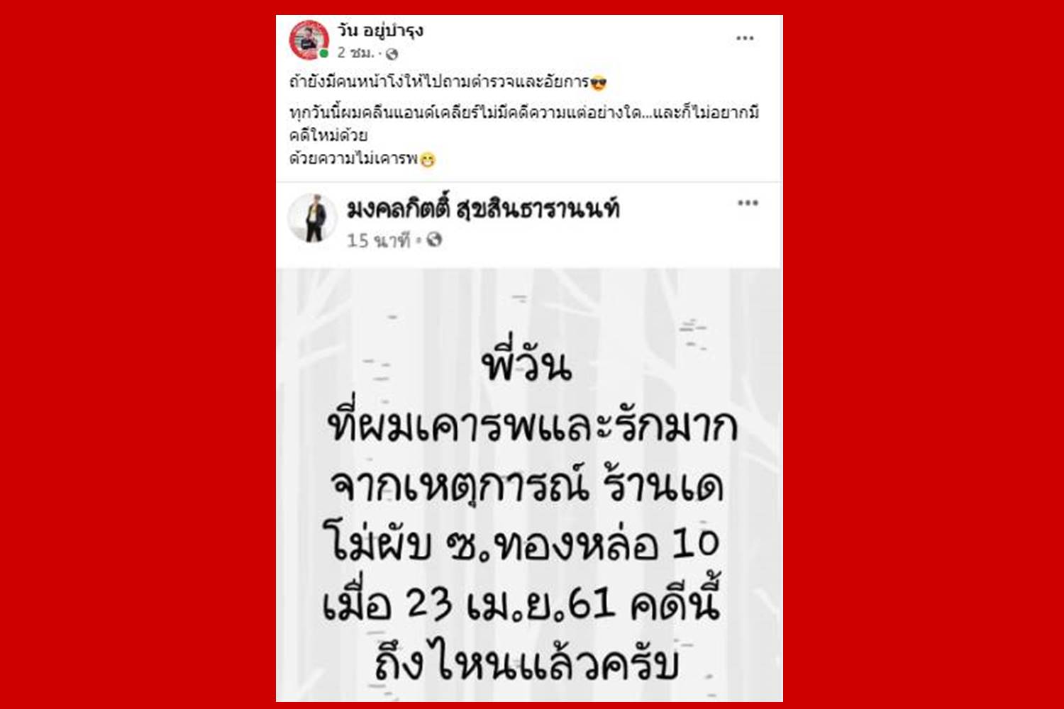 "ถ้ายังมีคนหน้าโง่ให้ไปถามตำรวจและอัยการ ทุกวันนี้ผมคลีนแอนด์เคลียร์ไม่มีคดีความแต่อย่างใด...และก็ไม่อยากมีคดีใหม่ด้วยด้วยความไม่เคารพ"