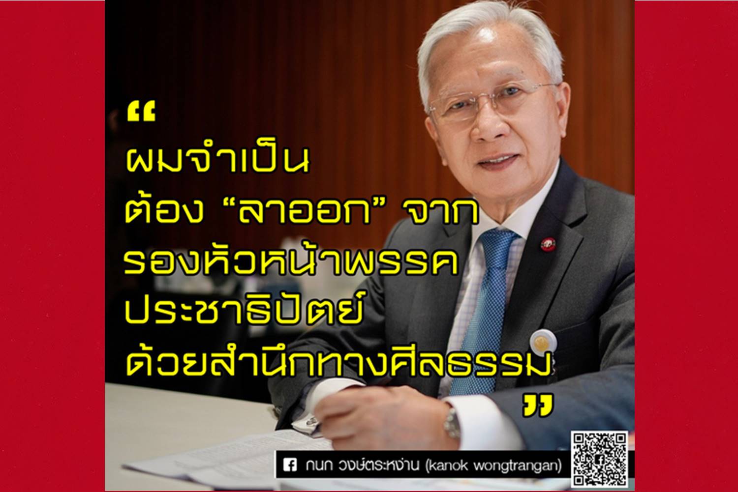 "กนก วงษ์ตระหง่าน" ลาออกจากรองหัวหน้าพรรคประชาธิปัตย์ให้เหตุผล"สำนึกทางศีลธรรม" ซัดการดำเนินการของ"จุรินทร์"สวนทางกับความคาดหวังของสังคมด้านสำนึกความรับผิดชอบ