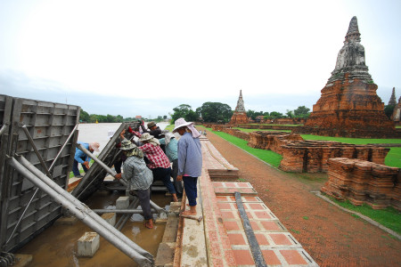 กรมศิลปากรยกแผงกั้นน้ำชั่วคาวหน้าวัดไชวัฒนารามหลังน้ำเจ้าพระยาหนุนสูง