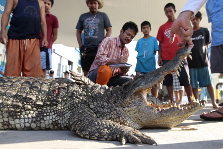 เมื่อวันที่ 23 ต.ค. เจ้าหน้าที่อาสาสมัครมูลนิธิป่อเต็กตึ๊งได้รับแจ้งจากชาวบ้าน ว่าพบจระเข้ความยาวประมาณ 2 เมตร ขึ้นมานอนอยู่บนร้านค้าบน ถนนกาญจนาภิเษก ใกล้แยกบางกรวย-ไทรน้อย อ.บางบัวทอง จ.นนทบุรี จึงรีบนำกำลังไปที่เกิดเหตุพร้อมด้วยเจ้าหน้าที่จากกรมประมงจังหวัด พบจระเข้ความยาวประมาณ 2 เมตร 1 ตัวนอนหลบแดดอยู่บริเวณหน้าร้านค้าซึ่งมีน้ำท่วมประมาณ 50 ซม. จึงรีบช่วยกันจับนานกว่า 10 นาทีจึงสามารถจับได้ นอกจากนี้ในเวลาไล่เลี่ยกันชาวบ้านยังสามารถจับจระเข้ได้อีก 1 ตัว ขณะลอยคออยู่กลางถนน