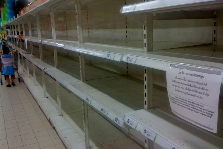 จากการสำรวจชั้นวางสินค้าในหลายสาขาของดิสเคาน์สโตร์ใหญ่ๆ พบว่าขณะนี้มีสินค้าเกือบครบทุกหมวด มีเพียงสินค้า 3 ชนิดเท่านั้นที่ยังหายไปจากตลาดแบบกู้ไม่กลับ นั่นคือ น้ำดื่ม ยารักษาโรค และบำหมี่กึ่งสำเร็จรูป!!!!