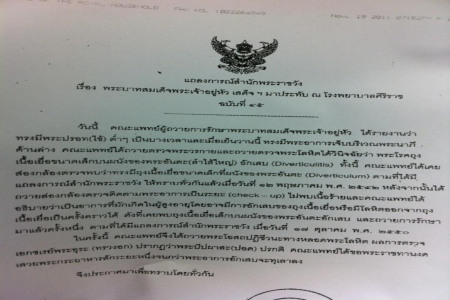 วันนี้ คณะแพทย์ผู้ถวายการรักษาพระบาทสมเด็จพระเจ้าอยู่หัว ได้รายงานว่าทรงมีพระปรอท (ไข้)ต่ำๆ เป็นบางเวลาและเมื่อเย็นวานนี้ ทรงมีพระอาการเจ็บบริเวณพระนาภีด้านล่าง คณะแพทย์ได้ถวายตรวจพระวรกายและถวายตรวจพระโลหิตได้วินิจฉัยว่า พระโรคถุงเนื้อเยื่อขนาดเล็กบนผนังของพระอันตะ (ลำไส้ใหญ่) อักเสบ (Diverticulitis) ทั้งนี้ คณะแพทย์ได้เคยส่องกล้องตรวจพบว่าทรงมีถุงเนื้อเยื่อขนาดเล็กที่ผนังของพระอันตะ (Diverticulum) ตามที่ได้มีแถลงการณ์สำนักพระราชวังให้ทราบทั่วกันแล้วเมื่อวันที่ 12 พฤษภาคม พ.ศ.2542 หลังจากนั้นได้ถวายส่องกล้องตรวจติดตามพระอาการเป็นระยะ (check-up) ไม่พบเนื้อร้ายและคณะแพทย์ได้อธิบายว่าเป็นอาการที่มักเกิดในผู้สูงอายุ โดยอาจมีการอักเสบของถุงเนื้อเยื่อหรือมีโลหิตออกจากถุงเนื้อเยื่อเป็นครั้งคราวได้ ดังที่เคยพบถุงเนื้อเยื่อเล็กบนผนังของพระอันตะอักเสบ และถวายการรักษามาแล้วครั้งหนึ่ง ตามที่ได้มีแถลงการณ์สำนักพระราชวัง เมื่อวันที่ 17 ตุลาคม พ.ศ. 2550