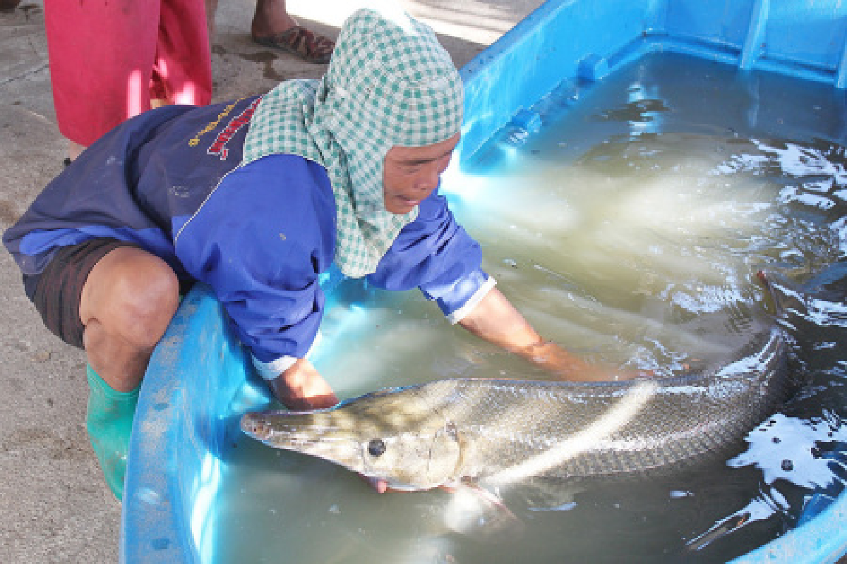 ชาวบ้านเมืองปทุมฯดักปลาติดปลาปากจระเข้นัก 50 กก.ยาว 1.40 เมตร