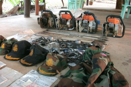 เจ้าหน้าที่ป่าไม้ ตชด. ทหาร ยึดเลื่อยโซ่ยนต์ 4เครื่อง เสื้อและบัตรประจำตัวทหารกัมพูชาลอบตัดไม้ชายแดน
