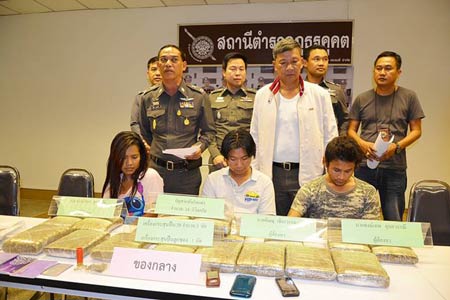 พล.ต.ต.สมิทธิ มุกดาสนิท ผบก.ภ.จว.ปทุมธานี พร้อมด้วย พ.ต.อ.อำนาจ จันทร์เจริญ รอง.ผบก.ภ.จว.ปทุมธานี แถลงผลจับกุม น.ส.ประภัสสร สุขสมกิจ อายุ 33 ปี บ้านเลขที่ 2/123 ม.5 ต.คลองสอง อ.คลองหลวง จ.ปทุมธานี นายพิษณุ เชียงวรรณา อายุ 29 ปี บ้านเลขที่ 19/363 ม.1 ต.คูคต อ.ลำลูกกา จ.ปทุมธานี และ นายพงษ์เทพ อุบลวรรณี อายุ 25 ปี บ้านเลขที่ 3 ม.3 ต.บ้านรี อ.เมืองอ่างทอง จ.อ่างทอง พร้อมด้วยกัญชาแห้งอัดแท่ง จำนวน 18 กิโลกรัม โดยจับกุมได้ที่ หมู่บ้านธารารินทร์ เลขที่ 100/498 ม.1 ต.คูคต อ.ลำลูกกา จ.ปทุมธานี