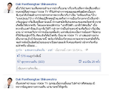 นายพานทองแท้ ชินวัตร บุตรชาย พ.ต.ท.ทักษิณ ชินวัตร อดีตนายกรัฐมนตรี รองผู้อำนวยการสถานีโทรทัศน์วอยซ์ ทีวี ได้โพสต์ข้อความบนเฟซบุ๊กส่วนตัว Oak Panthongtae Shinawatra ตั้งแต่เมื่อวานที่ผ่านมา กรณีชายอดีตการ์ดพันมิตรประชาชนเพื่อประชาธิปไตย ไปทุบรถผู้สื่อข่าวของ Voice TV ที่ไปทำข่าวการชุมนุมของกลุ่มพันธมิตร ที่เวทีลีลาศ สวนลุมพินี เมื่อวันที่ 10 มี.ค. มีเนื้อหาดังนี้