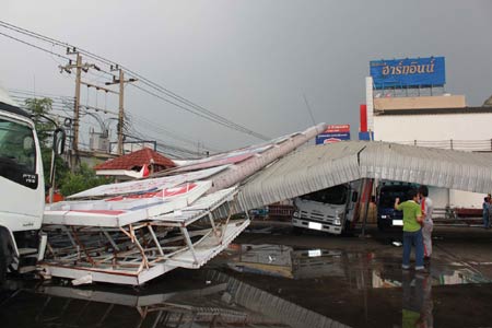 เมื่อเวลา 17.00 น. ร.ต.อ.สมนึก แก้วพูลศรี ร้อยเวร สภ.เมืองสมุทรปราการ ได้รับแจ้งมีเหตุป้ายโฆษณาขนาดใหญ่ล้มลงมาทับโครงหลังคาที่จอดรถของศูนย์ซ่อมรถยนต์ยี่ห้อ ฮีโน่ ซึ่งเป็นของบริษัท ชุ่นหลี สมุทรปราการ จำกัด ตั้งอยู่เลขที่ 333 หมู่ 5 ถนนศรีนครินทร์ ต.บางเมือง อ.เมือง สมุทรปราการ มีรถยนต์ได้รับความเสียหายหลายคัน หลังรับแจ้งจึงเดินทางตรวจสอบที่เกิดเหตุ