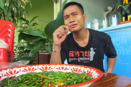 ขณะเดียวกันนายโก้ได้นั่งเคี้ยวพริกขี้หนูเข้าไปเกือบ 50 เม็ด และหลังจากนั้นได้คายเมล็ดพริกที่เคี้ยวในปากออกมาใส่มือ พร้อมทาไปบนใบหน้า แต่ก็ยังรู้สึกเฉย ๆ ไม่มีน้ำตาออกแม้แต่หยดเดียว สภาพปากและใบหน้า และตามผิวหนังที่ถูกทาด้วยพริกขี้หนู ยังอยู่ในลักษณะปกติ ไม่อาการปวดแสบปวดร้อน