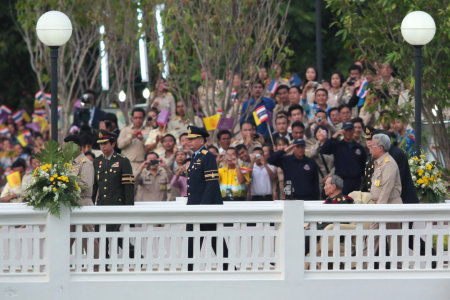 ที่บริเวณใต้อาคารเฉลิมพระเกียรติ พระบาทสมเด็จพระเจ้าอยู่หัว ฉลองพระองค์เครื่องแบบทหารบก มีพระพักตร์สดใส และแย้มพระสรวล ยังความปลาบปลื้มให้เหล่าพสกนิกรที่เดินทางมารอเฝ้าตั้งแต่เมื่อช่วงเช้าที่ผ่านมาต่างพร้อมใจกันเปล่งเสียง ทรงพระเจริญกึกก้อง