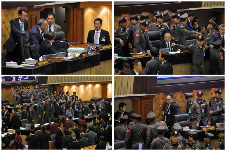 จากนั้น เจ้าหน้าที่ตำรวจสภาและสส.พรรคประชาธิปัตย์ พยายามกันกลุ่มบุคคลทั้งหมดออกจากห้องประชุมสภาไปอยู่บริเวณด้านหลังลังก์ซึ่งเป็นทางออกของประธานสภา ก่อนแยกย้ายไปจับกลุ่มวิจารณ์