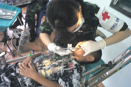 “คนที่นี่ไม่ค่อยดูแลสุขภาพช่องปาก แม้แต่อายุน้อยๆ เองก็ใส่ฟันปลอมกันแล้ว โดยส่วนใหญ่จะมี 2 อย่าง คือ รักษารากฟันกับการถอนฟัน คนที่นี่ไม่มีเวลารักษารากฟัน เพราะการรักษารากฟันหมอจะนัดหลายครั้งและต้องเสียเงิน ฟันปลอมที่นี่ก็เลยจะใช้กันเยอะ ซึ่งโครงการศูนย์ทันตแพทย์ทหารบกของชายแดนใต้ ที่นอกจากจะอยู่โรงพยาบาลค่ายอิงคยุทธฯ แล้ว ยังมีที่ค่ายสิรินธร กับพระตำหนักทักษิณ ถ้าชาวบ้านสนใจก็จะผ่านมาทาง ฉก.ทหาร ให้พาไปได้ทั้ง 3 แห่ง” นุจรี บอก