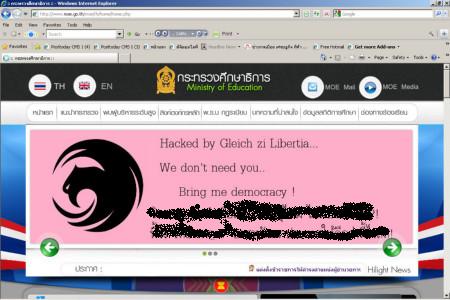 เมื่อวันที่ 17 ก.ย. เว็บไซต์กระทรวงศึกษาธิการ(ศธ.) www.moe.go.th ได้ถูกแฮกเกอร์ที่ใช้ชื่อว่า "Gleich zi Libertia" ซึ่งได้เข้าไปเปลี่ยนข้อความบนหน้าแรกของเว็บไซต์ของกระทรวง โดยข้อความตอนหนึ่งระบุว่า "พวกเราคือ Libertia เราทำในสิ่งเราอยากทำ เพื่อรักษาเสรีภาพของเรา คุณไม่มีสิทธิ์ในการควบคุมวัยรุ่นอยากพวกเรา เรามีชีวิต เรามีกฎของพวกเราเอง"