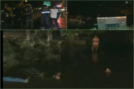 รถพ่วง 18 ล้อเสยท้ายรถบัสโรงงานตกคลองจมน้ำ