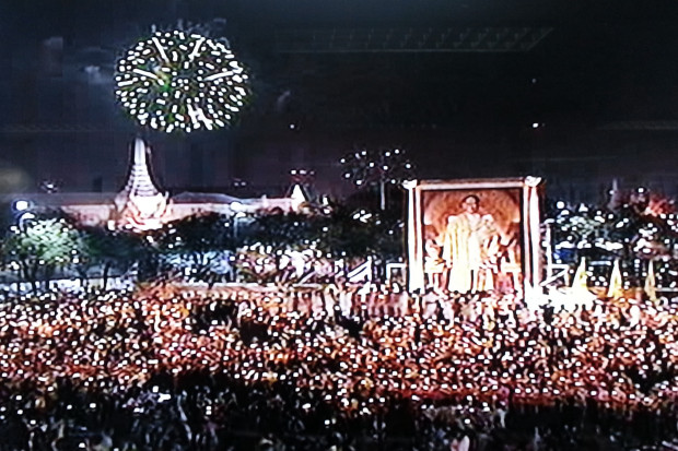 นายกรัฐมนตรีได้เปิดกรวยกระทงดอกไม้ ถวายเครื่องราชสักการะและถวายความเคารพ และเริ่มจุดเทียนชัยเพื่อประกอบพิธีถวายพระพรชัยมงคล โดยนายกรัฐมนตรีเป็นผู้นำกล่าวถวายราชสดุดีเฉลิมพระเกียรติและถวายพระพรชัยมงคลหน้าพระบรมสาทิสลักษณ์ วงดุริยางค์บรรเลงเพลงสรรเสริญพระบารมี จากนั้นนายกรัฐมนตรีรับมอบโคมเทียนแล้วนำร้องเพลงสดุดีมหาราช 2 จบ และ เปล่งเสียง "ทรงพระเจริญ" 3 ครั้ง พร้อมกับ ประชาชนทุกหมู่เหล่า ดังกึกก้องทั่วท้องสนามหลวง พร้อมกับประชาชนทุกจังหวัดทั่วราชอาณาจักร มีการจุดพลุและดอกไม้ไฟเริ่มการแสดงมหรสพต่างๆ