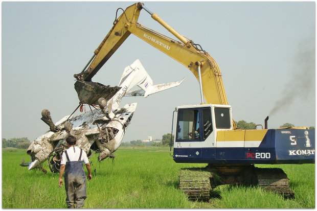 ด้านนาวาอากาศตรี วินัย มีพงษ์ ทีมช่างของ บ.เอเชี่ยนแอโร่วเสปซเซอร์วิช จำกัด ได้เปิดเผยว่า ทางบริษัท จะทำการเคลื่อนย้ายซากเครื่องบิน โดยจะทำการถอดปีกทั้ง สองข้าง แล้วใช้รถ แบ็ดโฮล ยกชิ้นส่วน ขึ้นรถเทลเลอร์นำกลับไปที่ โรงเก็บเครื่องบิน ของบริษัท ซึ่งอยู่ที่สนามบินดอนเมือง ส่วนกล่องควบคุมการบินจะถูกส่งไปที่ บริษัท ไดมอนต์ ประเทศเยอรมัน เพื่อทำการพิสูจน์หาสาเหตุที่ทำให้เครื่องบินตก