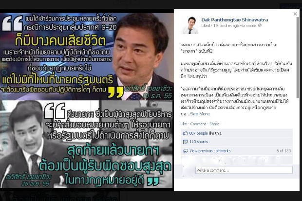 เฟซบุ๊กของนายพานทองแท้ ชินวัตร บุตรชายของพ.ต.ท.ทักษิณ ชินวัตร อดีตนายกรัฐมนตรี ลงจดหมายเปิดผนึกถึง นายอภิสิทธิ์ เวชชาชีวะ ฉบับที่ 2 ในประเด็นที่นายอภิสิทธิ์ ชักชวนคนไทยคว่ำประชามติแก้รัฐธรรมนูญ ทั้งที่เคยบอกเมื่อครั้งลงประชามติร่างรัฐธรรมนูญปี 2550 ว่า ให้รับร่างก่อน และตนเองจะเป็นคนแรกที่ยกมือให้มีการแก้ไข โดยนายพานทองแท้ ระบุว่า การที่หัวหน้าพรรคประชาธิปัตย์ออกมาปกป้องรัฐธรรมนูญปี 2550 เน้นไปที่มาตรา 309 กำลังสืบทอดเจตนารมณ์ของเผด็จการ พร้อมทิ้งท้าย ให้ติดตาม ฉบับ 3 เร็วๆ นี้