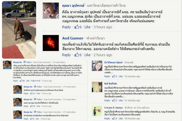 นอกจากนี้กลุ่มนักศึกษาของมรอ.ยังได้ร่วมโพสต์ชี้แจงเกี่ยวกับข่าวดังกล่าวด้วย อาทิ ผู้ใช้เฟซบุ๊กชื่อ "Dz'Khwan Spizii" ที่โพสต์ข้อความว่า "หนูเป็นนักศึกษามหาวิทยาลัยราชภัฏอุตรดิตถ์ ขอยืนยันว่าข่าวที่ออกมาไม่เป็นความจริงแต่อย่างใดเลยค่ะ กรุณาอย่าทำให้สถาบันเราเสียงชื่อเสียงอีกเลยค่ะ..." และ ผู้ใช้เฟซบุ๊ก ชื่อ "Cream-k Jariya" ที่โพสต์ยืนยันเช่นกันว่า "หนูก็เป็นนักศึกษามหาวิทยาลัยราชภัฏอุตรดิตถ์ค่ะ เรียนกับ อ.เบญ ด้วยขอยืนยันว่าไม่เป็นความจริงแต่อย่างใดเลยค่ะ"