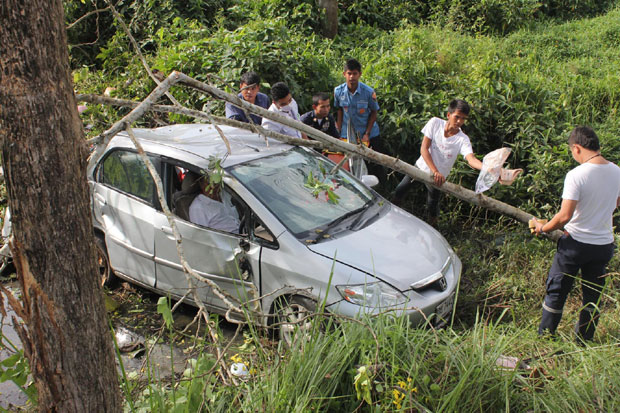 เก๋งตกคูน้ำเจอกิ่งไม้เสียบทะลุกระจก