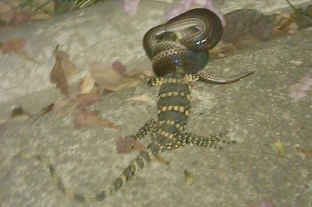 นายวุฒิศักดิ์ ถุนิยม อาสาสมัครกู้ภัยอยุธยาและอยู่บ้านเลขที่ 49/2 หมู่ 5 ต.ไผ่ล้อม อ.ภาชี จ.พระนครศรีอยุธยา ได้โชว์ภาพงูแสงอาทิตย์ขนาดใหญ่ยาวกว่า 1 เมตร กำลังบีบรัดจะกินลูกตัวเงินตัวทองขนาด 1 ฟุต และท้ายที่สุดภายหลังต่อสู้กันนานกว่า 20 นาที งูแสงอาทิตย์ชนะและสามารถกลืนกินลูกตัวเงินตัวทองไปทั้งตัว ซึ่งเหตุการณ์เกิดเมื่อกลางดึกที่ผ่านมาหลังโรงงานผลิตกระเบื้องแห่งหนึ่งในอ.หนองแค จ.สระบุรี