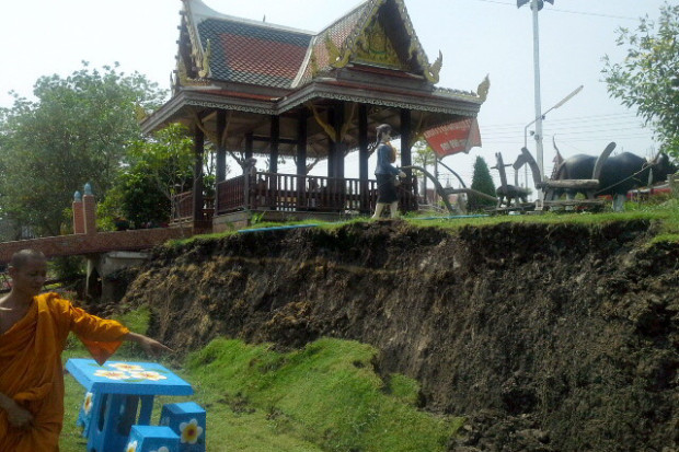 พระใบฎีกาเอกลักษณ์ อายุ 30 ปี กล่าวว่า ปีนี้แล้งกว่าทุกปี โดยน้ำแห้งลงทำให้ตลิ่งได้พังทรุดอย่างรวดเร็ว ซึ่งการพังยังไม่หยุดนิ่ง เพราะระดับน้ำในคลอง ยังลดลงอย่างต่อเนื่อง ซึ่งมาจากภาวะภัยแล้ง ด้วยกรมชลประทานไม่สามารถ ส่งน้ำเพิ่มเข้าในคลองได้ และชาวนาแย่งกันสูบน้ำ ที่มีน้อย เข้าไปทำนาในช่วงหน้าแล้ง ซึ่งทางวัดหวั่นเกรงว่า การพังของตลิ่ง จะลุกลามเข้าในพื้นที่ของวัดด้านใน ที่เป็นศาลาการเปรียญและพระอุโบสถ