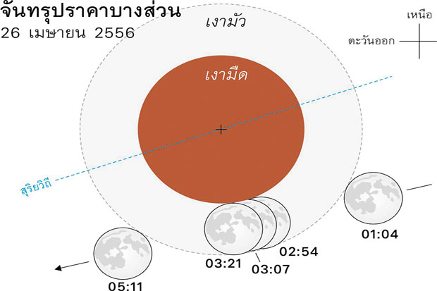 คืนวันพฤหัสบดีที่ 25 เม.ย. เข้าสู่เช้ามืดวันศุกร์ที่ 26 เม.ย. 2556 เป็นคืนวันเพ็ญ เกิดจันทรุปราคา ซึ่งนับเป็นอุปราคาครั้งแรกของปีนี้ แต่การที่ดวงจันทร์เฉียดเข้าไปในเงามืดของโลกเพียงเล็กน้อย ทำให้เห็นขอบดวงจันทร์ด้านหนึ่งแหว่งเว้าเข้าไปเพียงนิดเดียว และใช้เวลาขณะเกิดจันทรุปราคาบางส่วนไม่ถึงครึ่งชั่วโมง