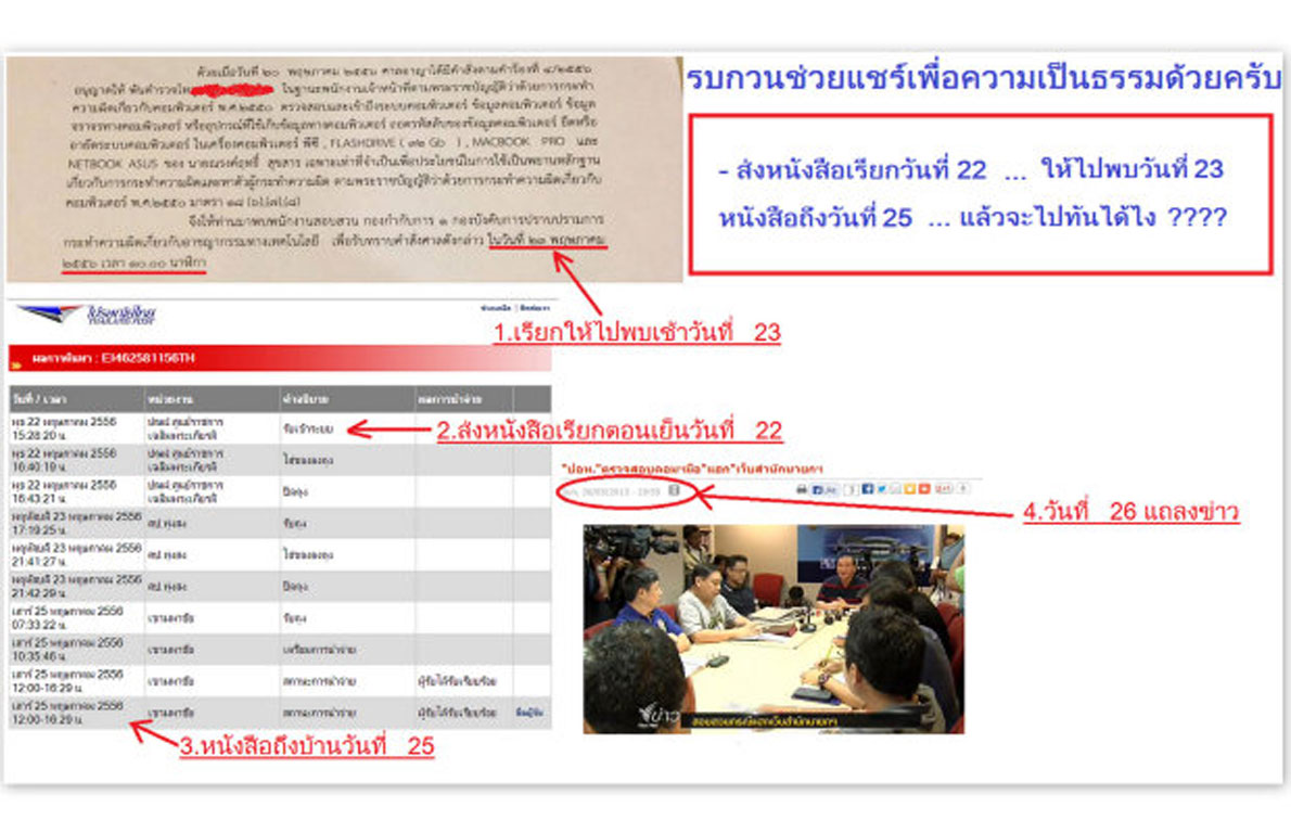 นายณรงค์ฤทธิ์ สุขสาร หรือ "ตาเล็ก วินโด้เก้าแปดเอสอี" ผู้ต้องสงสัย แฮกเว็บไซต์สำนักปลัดสำนักนายกรัฐมนตรี โพสต์รูปและเขียนข้อความในเว็บไซต์เฟซบุ๊กส่วนตัว ขอความเป็นธรรมว่า ตนมีทนายความ ซึ่งมีใบมอบอำนาจเรียบร้อย แต่ทำไมยังส่งจดหมายไปบ้านใน จ. นครศรีธรรมราช ที่ไม่ค่อยมีคนรับ ทำไม กองบังคับการปราบปรามการกระทำความผิดเกี่ยวกับอาชญากรรมทางเทคโนโลยี (ปอท.) ถึงส่ง EMS จากกรุงเทพฯ ไปนครศรีธรรมราช ตอนเย็น โดยเรียกให้มาถึงกรุงเทพฯ แต่เช้า แล้วการที่ส่งหมายเรียก วันที่ 22 ตอนเย็น เพื่อนัดให้มาพบวันที่ 23 ตอนเช้า แต่หมายเรียกมาถึง วันที่ 25 ช่วงสาย แบบนี้จะมีใครมาทันเวลา