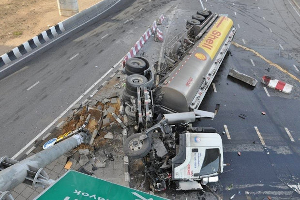 ที่เกิดเหตุ พบรถบรรทุกพ่วงชนป้ายบอกทางและแท่งปูนแบริเออร์หัวเกาะเลี้ยวขึ้นสะพานไปนครนายก หน้ารถพังยับเยิน คนขับได้รับบาดเจ็บสาหัส ถูกนำตัวส่ง ร.พ.ไปแล้ว ซึ่งเป็นรถบรรทุกน้ำมันของเชลล์ จำนวน 36,000 ลิตร ตัวแม่หมายเลขทะเบียน 79-4821 กรุงเทพ ตัวพ่วง 79-4827 กรุงเทพ ทำให้รถน้ำมันตระแคงขวางถนนทางรถเลี้ยวขึ้นไปนครนายก ทำให้มีนำมันดีเซลรั่วไหลออกมานองพื้นถนน