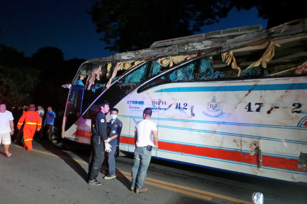 ทั้งนี้ที่เกิดเหตุพบรถทัวร์ของบริษัทสมบัติทัวร์ เป็นรถปรับอากาศชั้น 2 หมายเลขทะเบียน 13-6495 กรุงเทพมหานคร ซึ่งเป็นรถทัวร์เส้นทาง กรุงเทพ-ทุ่งช้าง โดยรถทัวร์มีสภาพด้านซ้ายกระจกแตกและมีรอยครูดตลอดทั้งแถบ มีผู้โดยสารได้รับบาดเจ็บ เบื้องต้นมีอาการหนัก 4 ราย เป็นหญิง 2 ราย และ ชาย 2 ราย นอกจากนี้ยังพบผู้ได้บาดเจ็บจากโดนเศษกระจกบาดและตามลำตัวฟกช้ำ อีก 5 ราย