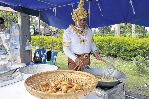 จากนั้นจึงเข้าไปสอบถามชื่อเสียงเรียงนามทราบชื่อว่า สมศักดิ์ ดงกระโทก หรือคุณลุงเปี๊ยก วัย 59 ปี ลูกหลานย่าโมนั่นเอง พร้อมกับเฉลยไขข้อข้องใจถึงสาเหตุแต่งกายเลียนแบบท่านเทวดาบนสวรรค์
