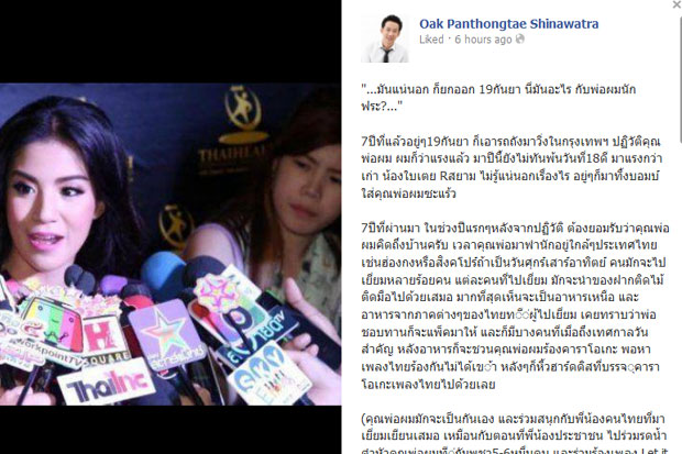 นายพานทองแท้ ชินวัตร บุตรชายของ พ.ต.ท.ทักษิณ ชินวัตร อดีตนายกรัฐมนต โพสต์ข้อความผ่านเฟซบุ๊กส่วนตัว Oak Panthongtae Shinawatra ถึงกรณีนักร้องลูกทุ่ง “ใบเตย” รับงานกินข้าว และร้องคาราโอเกะกับ "ทักษิณ" รับค่าตัว 1 ล้าน พร้อม กระเป๋าแบรนด์เนม ว่า "...มันแน่นอก ก็ยกออก 19กันยา นี่มันอะไร กับพ่อผมนักฟระ?..."