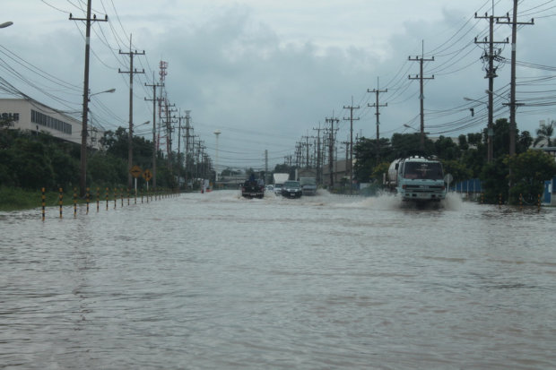 ขณะที่ ถนนสาย 3079 (บ้านโคกขวาง –ศรีมหาโพธิ) ต.ท่าตูม อ.ศรีมหาโพธิ เส้นทางผ่านนิคมอุตสาหกรรม304 ที่น้ำท่วมเป็นทางยาวกว่า 2 ก.ม.สูงกว่า 20 ซม.