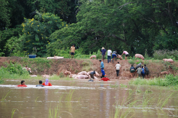 เมื่อวันที่ 30 ก.ย. ชาวบ้านต.วังพิกุล อ.วังทอง จ.พิษณุโลก ช่วยกันขนย้ายสัตว์เลี้ยง หมู ไก่ และสิ่งของในบ้านพักขึ้นสู่ที่สูง หลังจากพนังกั้นริมแม่น้ำวังทองบ้านทางลัดพังทะลายส่งผลทำให้น้ำจากแม่น้ำวังทองไหลเข้าท่วมพื้นที่หมู่บ้านอย่างรวดเร็ว ระดับน้ำสูง 1 เมตร สร้างความโกลาหลให้กับประชาชน