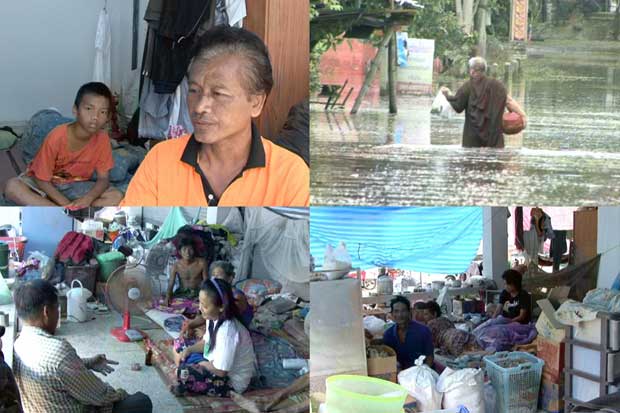ขณะนี้น้ำที่ท่วมขังได้เริ่มเน่าเสียและส่งกลิ่นเหม็นแล้ว ส่วนความเป็นอยู่ของชาวบ้านในศูนย์อพยพนั้น ต้องดำเนินชีวิตด้วยความยากลำบาก ไม่เหมือนอยู่ในบ้านของตัวเอง อย่างเช่นหญิงชราผู้นี้ป่วยเป็นไข้หวัด เจ้าหน้าที่ศูนย์ได้ให้ยามารับประทาน และขณะนี้อาการได้ทุเลาบ้างแล้ว