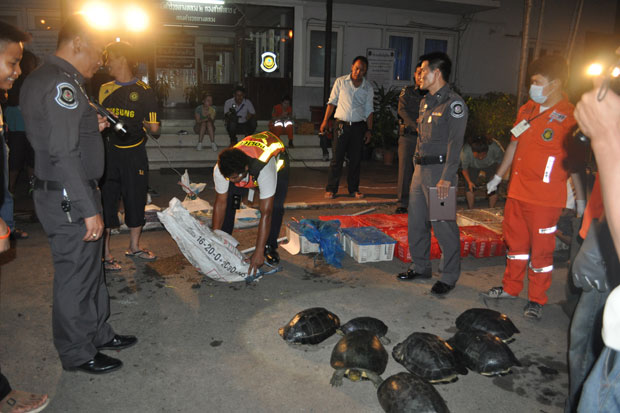 จึงส่งสัญญาณให้หยุดเพื่อขอตรวจค้นบริเวณกระบะตอนท้ายของตัวรถ ซึ่งเมื่อเปิดดูก็พบตระกร้าพลาสติก กระสอบปุ๋ยและกระสอบป่านจำนวนมากวางอัดแน่นอยู่ภายใน จึงได้ทำการตรวจสอบอย่างละเอียดพบสัตว์ป่าสงวนและสัตว์ป่าคุ้มครองจำนวนมากซุกซ่อนอยู่จึงทำการควบคุมตัวนายภูมินทร์ ธนะมัย อายุ 56 ปี อยู่บ้านเลขที่ 32/116 ม.1 ต.คลองเกลือ อ.ปากเกร็ด จ.นนทบุรี ซึ่งเป็นคนขับและนายวัลลภ นฤมิตรประชากร อายุ 41 ปี อยู่บ้านเลขที่ 236 ซ.เจริญนคร 14 ถ.เจริญนคร แขวงคลองตันไทร เจตคลองสาน กรุงเทพ ซึ่งนั่งโดยสารมาด้วยมาทำการสอบสวนที่สถานีตำรวจทางหลวงขอนแก่น