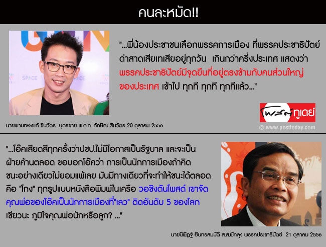 โอ๊คเสียดสีทุกครั้งว่าปชป.ไม่มีโอกาสเป็นรัฐบาล และจะเป็นฝ่ายค้านตลอด ขอบอกโอ๊คว่า การเป็นนักการเมืองถ้าคิดชนะอย่างเดียวไม่ยอมแพ้เลย มันมีทางเดียวที่จะทำให้ชนะได้ตลอดคือ "โกง" ทุกรูปแบบหนังสือพิมพ์ในเครือ วอชิงตันโพสต์ เขาจัดคุณพ่อของโอ๊คเป็นนักการเมือง"เลว" ติดอันดับ 5 ของโลกเชียวนะ ภูมิใจคุณพ่อนักหรือลูก?