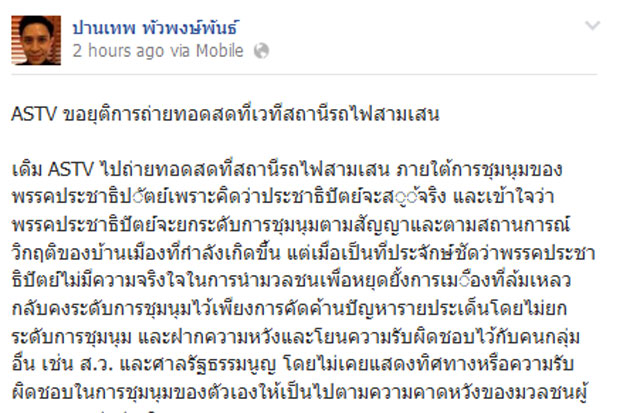 นายปานเทพ พัวพงษ์พันธ์ อดีตโฆษกพันธมิตรประชาชนเพื่อประชาธิปไตย โพสต์ข้อความผ่านบรเฟซบุ๊ก ส่วนตัวว่า เอเอสทีวี ขอยุติการถ่ายทอดสดที่เวทีสถานีรถไฟสามเสน ข้อความว่า