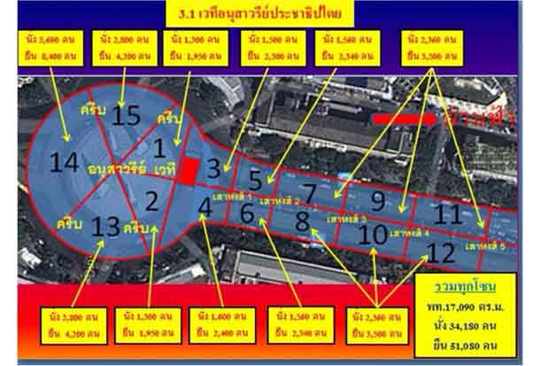 แหล่งข่าวความมั่นคง อธิบายว่า วิธีที่ฝ่ายความมั่นคงใช้ในการประเมินจำนวนผู้ชุมนุมคือการใช้สูตรทางคณิตศาสตร์ กล่าวคือคำนวณว่า 1 ตารางเมตร จะมีคนยืนได้กี่คนหรือคนนั่งได้กี่คน ซึ่งสูตรโดยทั่วไปคือ 1 ตารางเมตร ยืนได้ 4 คน ถ้านั่งจะได้ 2 คน