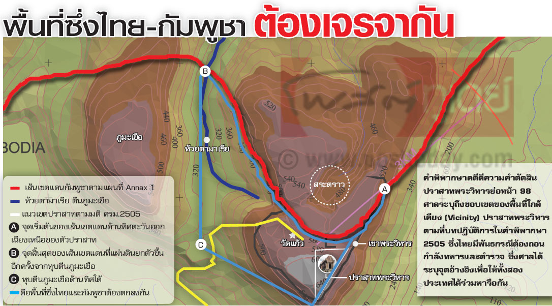 คำพิพากษาปี 2505 ไม่ได้ตีความข้อโต้แย้งของไทยในเรื่องความแตกต่างของแผนที่ภาคผนวก 1 (Annax 1) กับสถานที่จริง ดังนั้น ศาลในปัจจุบันจึงไม่สามารถตีความข้อโต้แย้งนี้ได้ อย่างไรก็ตาม ศาลจึงเห็นว่าทั้งสองฝ่ายควรที่จะหาข้อตกลงร่วมกัน โดยห้ามมิให้การแก้ไขปัญหาเป็นการกำหนดโดยฝ่ายใดฝ่ายหนึ่ง...