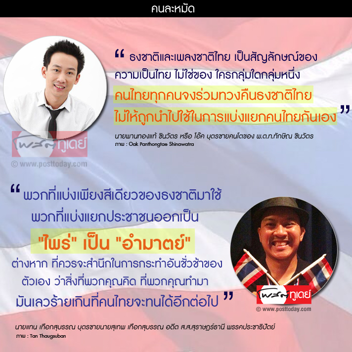 พวกที่แบ่งเพียงสีเดียวของธงชาติมาใช้ พวกที่แบ่งแยกประชาชนออกเป็น "ไพร่" เป็น "อำมาตย์" ต่างหาก ที่ควรจะสำนึกในการกระทำอันชั่วช้าของตัวเอง ว่าสิ่งที่พวกคุณคิด ที่พวกคุณทำมา มันเลวร้ายเกินที่คนไทยจะทนได้อีกต่อไป