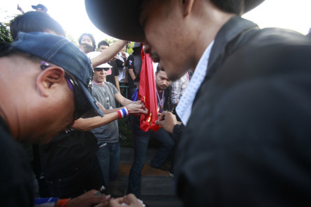 ชุมนุมหน้ารามวุ่น-นศ.รุมถอดเสื้อแดงเผา