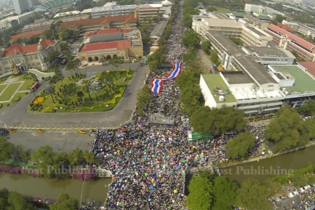 ภาพมุมสูงการชุมนุมของกลุ่มกปปส.ที่เดินขบวนมาปักหลักชุมนุมบริเวณรอบพื้นที่ทำเนียบรัฐบาลเมื่อวันที่ 9 ธ.ค.ที่ถูกบันทึกจากเฮลิคอปเตอร์บังคับของทีมช่างภาพ โพสต์พับลิชชิง