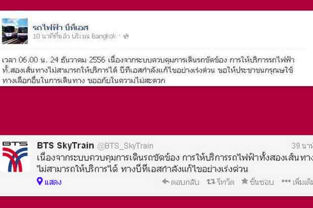 เมื่อวันที่ 24ธ.ค.เวลา 06.00 น. รถไฟฟ้าบีทีเอส แจ้งประชาสัมพันธ์ผ่านทวิตเตอร์ และเฟซบุ๊กว่า เนื่องจากระบบควบคุมการเดินรถขัดข้อง การให้บริการรถไฟฟ้าทั้งสองเส้นทางไม่สามารถให้บริการได้ บีทีเอสกำลังแก้ไขอย่างเร่งด่วน ขอให้ประชาชนกรุณษใช้ทางเลือกอื่นในการเดินทาง ขออภัยในความไม่สะดวก
