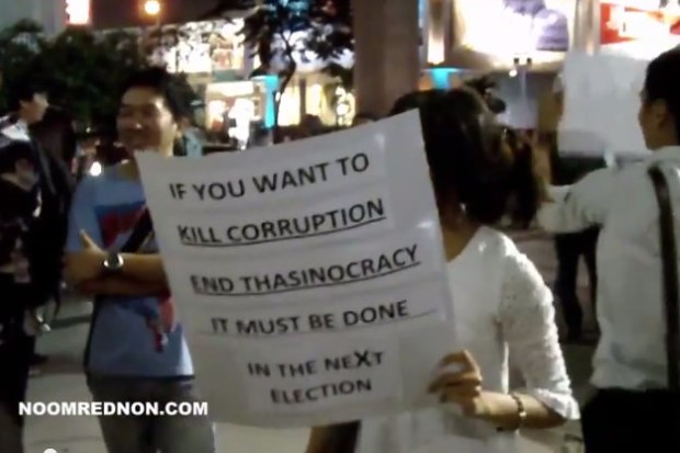 ทั้งนี้คลิปดังกล่าวได้ถูกโพสต์ขึ้นบนเว็บไซต์ยูทูบโดยสมาชิกชื่อ "Noom Rednon" ซึ่งเนื้อหาในคลิปเป็นเหตุการณ์ระหว่างการจัดกิจกรรมที่มี หญิงสาวที่เข้าร่วมกิจกรรมได้ชูกป้ายที่มีข้อความว่า "If you want to kill corruption End thaksinocracy It must be done In the next election" ซึ่งแปลเป็นไทยว่า ถ้าคุณต้องการทำลายการคอรัปชั่น ขจัดระบอบทักษิณ จะต้องทำหลังการเลือกตั้ง