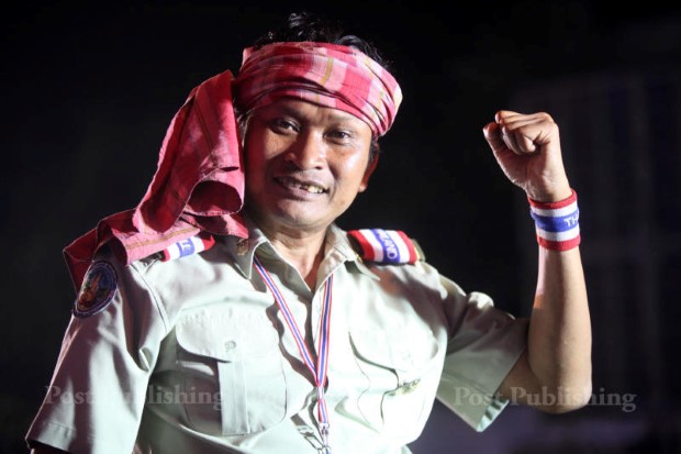 “แต่เพราะเขาไม่มีใครรู้จักเรา มันก็เลยถูกแซงคิวไปเรื่อยๆ ผมเห็นว่าแบบนี้มันจะเสียของ เพราะตอนแรกเราได้ช่วงเวลาหัวค่ำเลย ก็เลยไปขอคุยกับลูกหมี (ชุมพล จุลใส) ขอแซงคิวขึ้นมาหน่อยสุดท้าย สาทิตย์ (วงศ์หนองเตย) ก็ยอม ขณะนั้นผมขึ้นเวทีไปพร้อมกับเครือข่ายข้าราชการ มีเวลาปราศรัยเพียง 15 นาที แต่พอพูดไปสัก 10 นาที ก็ประเมินแล้วว่ามวลชนเอาด้วย ผมก็ไม่สนเวลาก็ใส่ยาวให้หมดไปก่อน สุดท้ายมันก็โอเค พอลงจากเวทีหลายคนก็เดินมาบอกว่าให้มาพูดอีก”