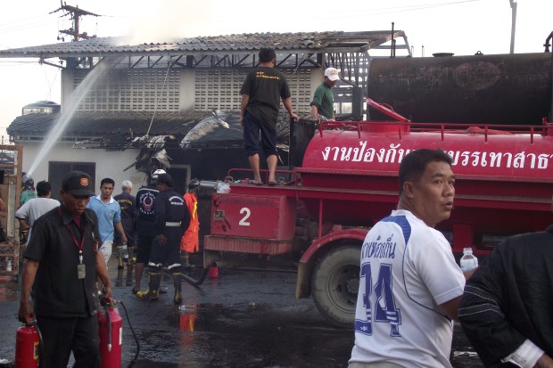 ที่เกิดเหตุพบเพลิงกำลังลุกไหม้อาคารที่เก็บถังน้ำมันเตาขนาดบรรจุประมาณ 9,000 ลิตร 4 ถังอย่างรุนแรง ทำให้เหล็กขาตั้งถังน้ำมันเตาจำนวน 2 ถัง อ่อนตัวลงและถังน้ำมันเตาได้หล่นลงมากระแทกพื้นและเกิดระเบิดขึ้น 2 ถัง ทำให้น้ำมันเตาไหลนองพื้นไปทั่วบริเวณ พนักงานในโรงงานวิ่งหนีเอาตัวรอดกันอลหม่าน ก่อนที่เจ้าหน้าที่จะสามารถควบคุมเพลิงให้อยู่ในวงจำกัด