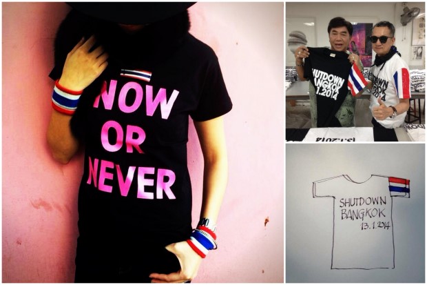 เหล่าคนดังที่ออกมาออกแบบเสื้อยืดรายต้น ๆ ได้แก่ กบ-เมนาท นันทขว้าง แห่งแบรนด์ SODA คนในวงการแฟชั่นที่หันมาทำเสื้อยืดรณรงค์ต่อต้านการคอรัปชั่นของรัฐบาลเป็นรายแรก ๆ เช่นเดียวกับ ศักดิ์ชัย กาย เจ้าของนิตยสารลิปส์ จุดกระแส “Shutdown BKK” จำหน่ายถล่มทลาย ปัจจุบันก็ยังทำการผลิตอยู่แต่จำหน่ายในราคาหลักพันบาท หรือ ศักดิ์วุฒิ วิเศษมณี ที่ออกแบบเสื้อยืดคอลเลคชั่นพิเศษออกมาลำดับที่ 4 เพราะเมื่อลายหมดแล้วหมดเลย ไม่ผลิตซ้ำ หรือทีเชิ้ตสวยเก๋ แขนเสื้อเป็นลายธงชาติ ที่ออกแบบโดย อ.ถาวร โกอุดมวิทย์