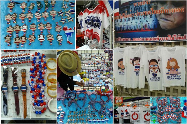 ใช่จะคึกคักแต่การปราศรัยของแกนนำกับความบันเทิงของเหล่าศิลปินนักร้องเท่านั้น ทว่า เวทีหลักแยกปทุมวัน ยังคึกคักด้วยร้านรวงพ่อค้าแม่ค้า ที่รวมพลขนของมาเอาใจนักช็อป ละลานตาเต็มถนนและริมทางเท้า ของแปลก ของดี ของใช้ ของกินเก๋ๆ ก็เยอะ แน่นอน ของอินเทรนด์ ทันกระแสชาวม็อบ ฮิตสุดๆ คงหนีไม่พ้น สินค้าลายธงชาติ สารพัดกลาดเกลื่อน เสื้อยืดสกรีนธงชาติ หมวก เข็มกลัด นกหวีด เนกไท โบว์ แว่นตา ร่ม พัด