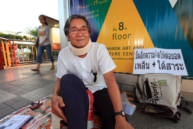 ใครผ่านไปแถวอนุสาวรีย์ชัยสมรภูมิ คงคุ้นหน้าคุ้นตากับชายชราสวมแว่นสายตากรอบหนา ใบหน้ายิ้มแย้มอารมณ์ดี ใส่ที่บล็อคคอสำหรับป้องกันโรคหมอนรองกระดูกสันหลังเคลื่อนกดทับเส้นประสาท อันเป็นเอกลักษณ์เฉพาะตัว โดยมีป้ายเบ้อเริ่มตั้งไว้ข้างตัวเขียนว่า "เมื่อขอทานเขียนหนังสือ"