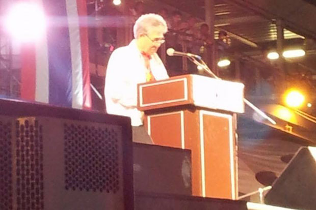 สมเกียรติขึ้นเวทีราชประสงค์ ชำแหละเนื้อหา “คอนเวอร์เซชั่นวิธทักษิณ”ฉบับแปล ถูกบิดเบือน ตัดเนื้อหาหมิ่นบางส่วน มัด ทักษิณ จาบจ้วง